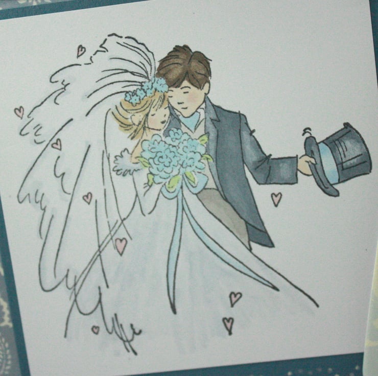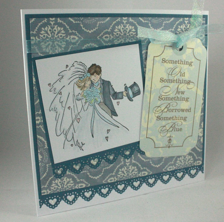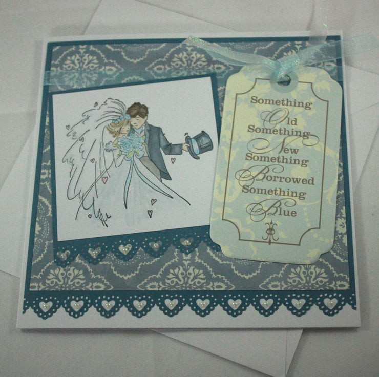 Square wedding card featuring a hand stamped and coloured image of a bride and groom and a printed tag with the saying 'Something Old, Something New, Something Borrowed, Something Blue'. Both the image and tag have been layered over a blue and white printed background paper, with faux pearls finishing the punched heart edging. The tag has been tied with pale blue and irridescent white organza ribbon.