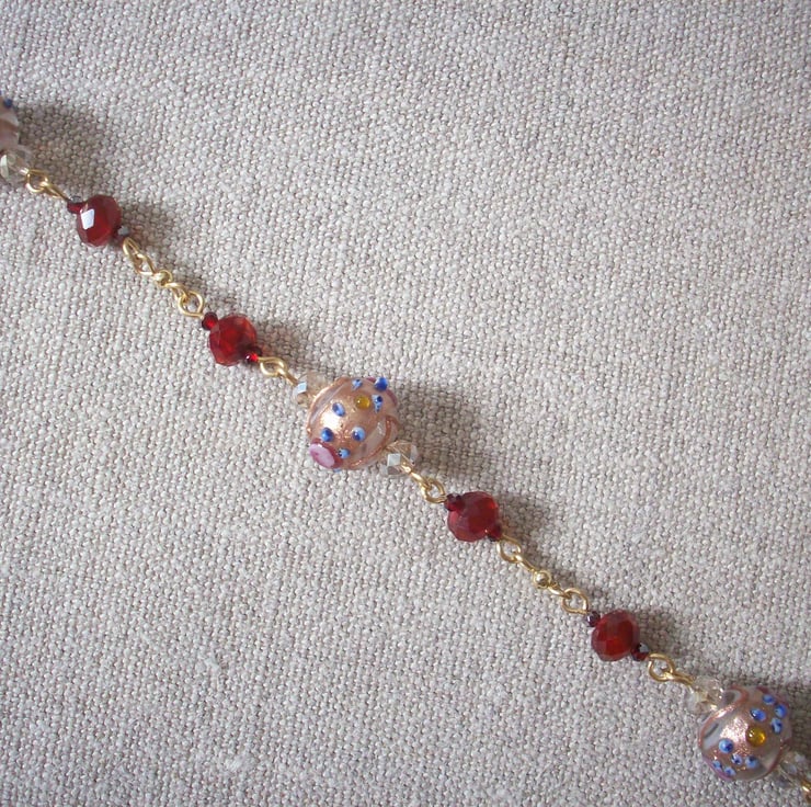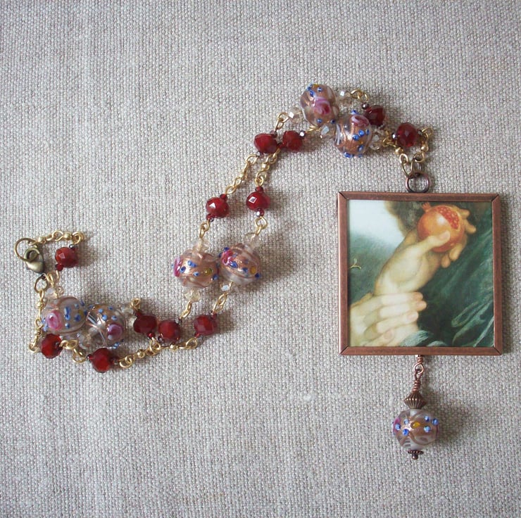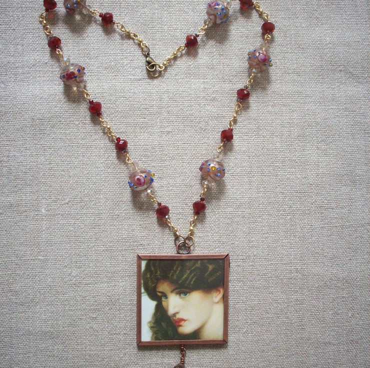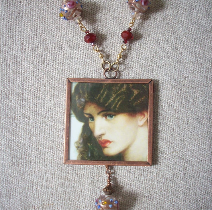Found image under glass. This is possibly the artist's most famous work, so often seen in posters and the original lives in Tate Britain on Millbank. The model was Jane Morris muse and love of Rossetti's later years. She really was this beautiful, some wonderful sepia photographs of her survive to show this. Set on a chain of fabulously embellished Venetian beads with gold and tiny roses applied - how do they do it? One of these is used as a drop, too. Comes to you in an organza bag. I always use Special Delivery for the insurance cover for both buyer and seller. Please contact me for non UK and multiple orders as prices vary. Thanks for looking and for supporting handmade!