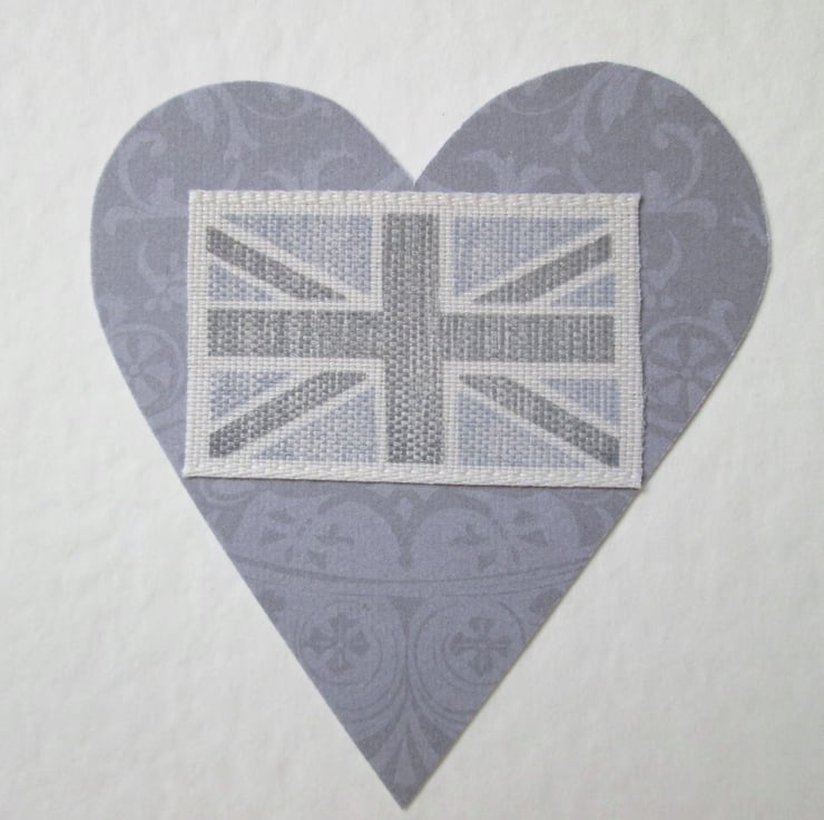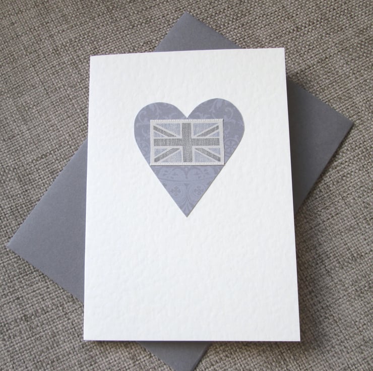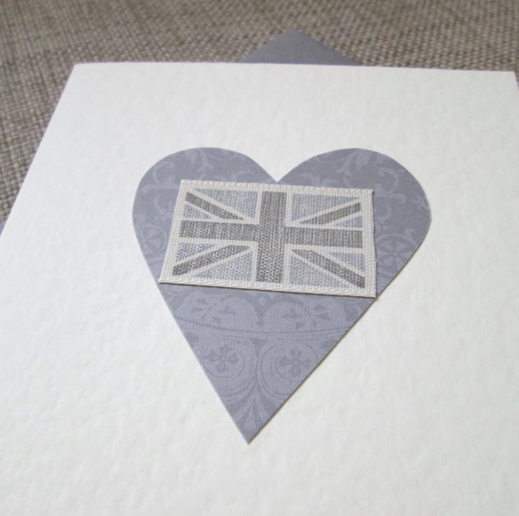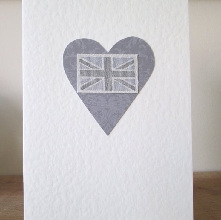 A classy card with a fabric Union Jack in subtle greys on a paper heart with a contrasting regal pattern. A perfect card for an anniversary, Valentine's Day, wedding or any occasion. The card is ivory with a lovely 'hammered' texture and A6 in size with a coordinating grey envelope, packaged in a cellophane wrapper.