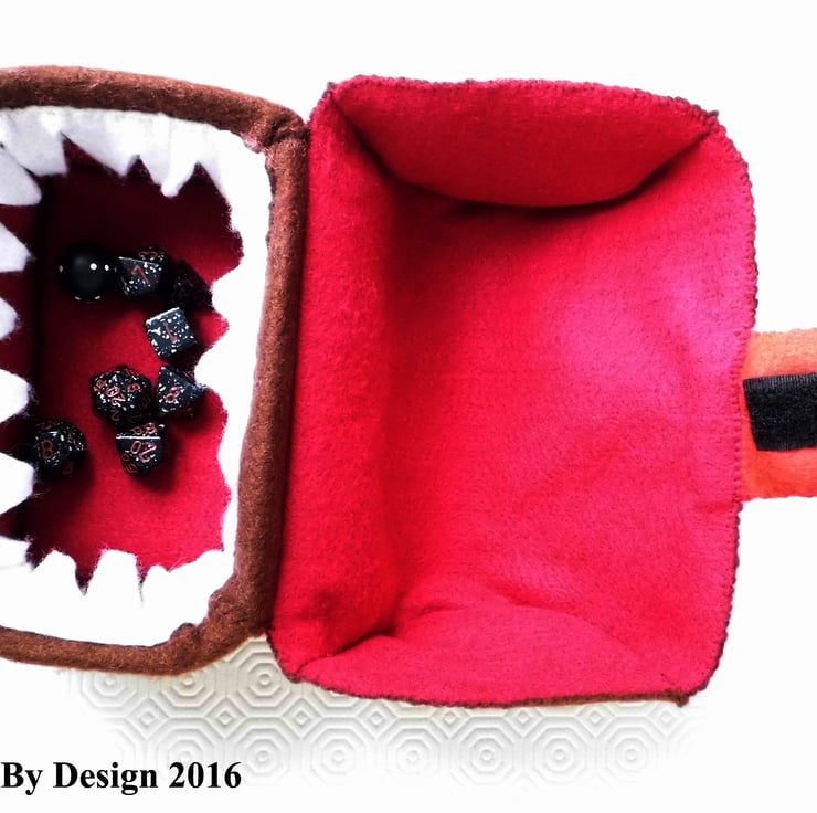 The eyes are cut from white and black and the tongue is cut from red felt and is stuffed with hollow fibre filling and has velcro sewn securely on the back to keep your dice safe inside.