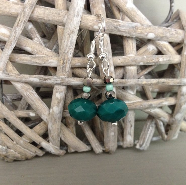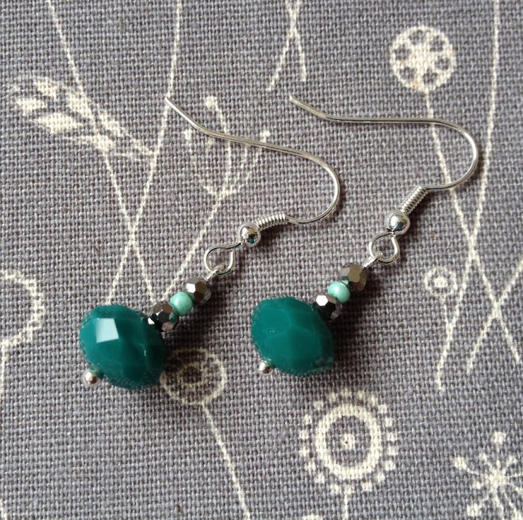 Pretty earrings made with a faceted emerald-green bead which catches the light, and silver-plated earring hooks. Fun and fresh with a little bit of a retro feel.