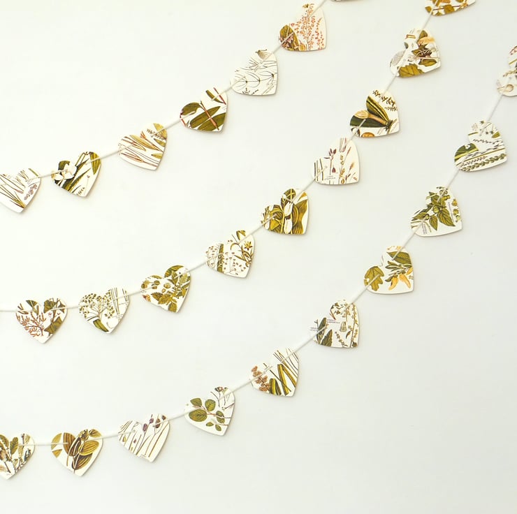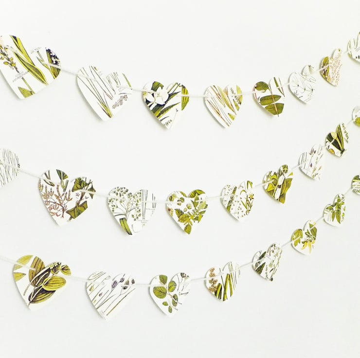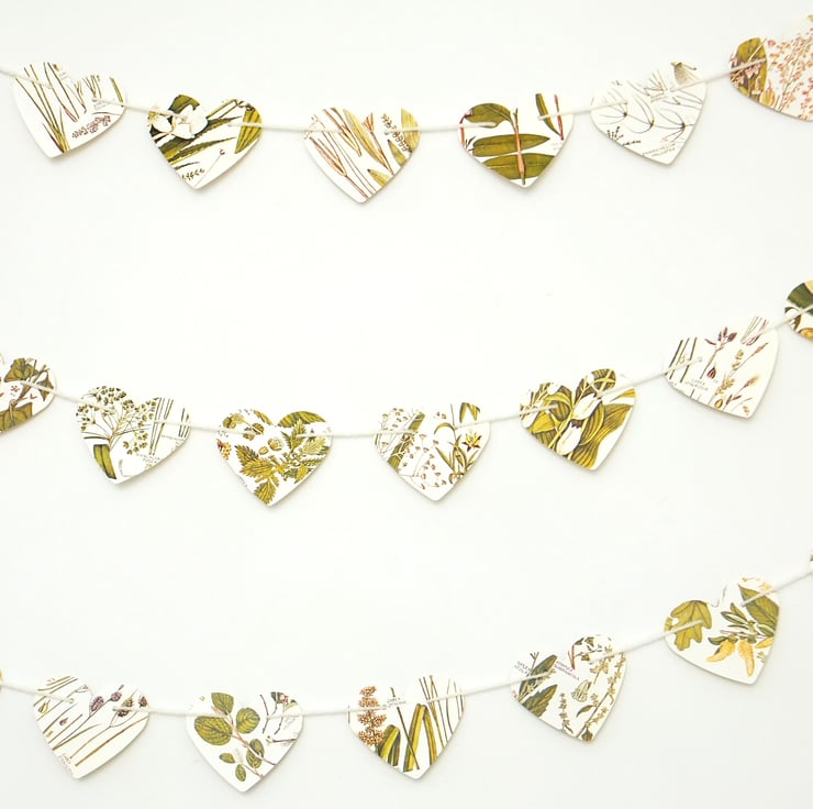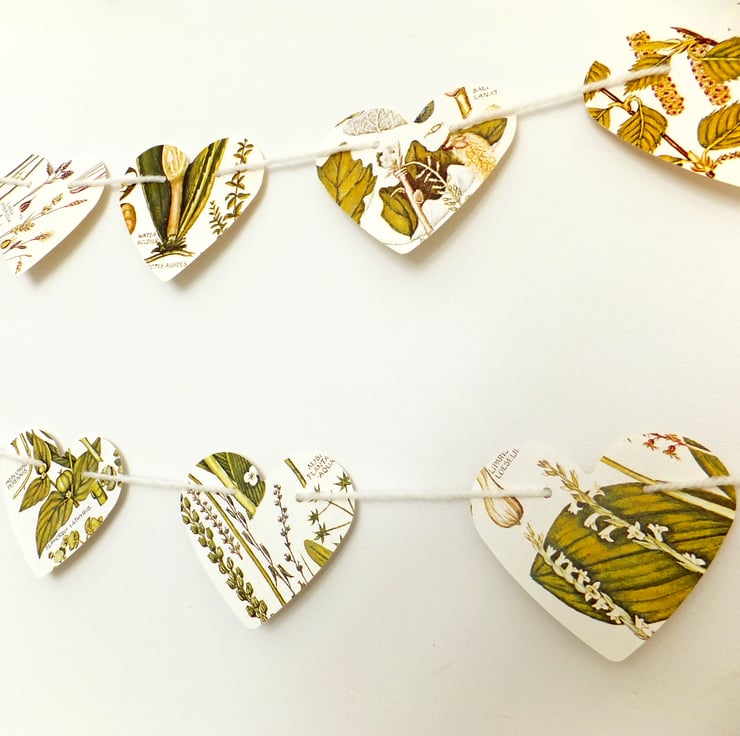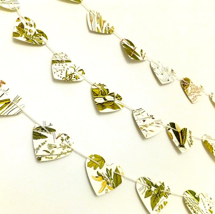 This lovely Botanical Hearts Bunting would be fabulous for a wedding, bridal shower or for any room in your home to bring nature inside! This lovely paper bunting has been up-cycled from a vintage book of botanical drawings with plants in greens and whites.
