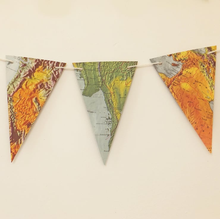 This map bunting has been up-cycled from a vintage World Atlas, published in the 1960's. The flags of the garland show parts of the physical maps of a mixture of places throughout the world, This garland would look wonderful in any room and adds a lovely summer feel to your decor! It would also be gorgeous for wedding decor.