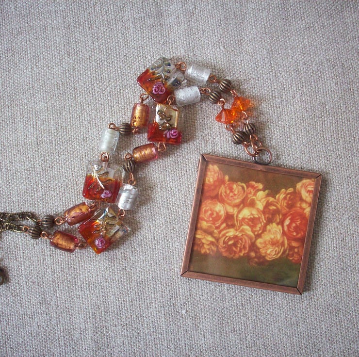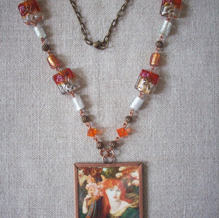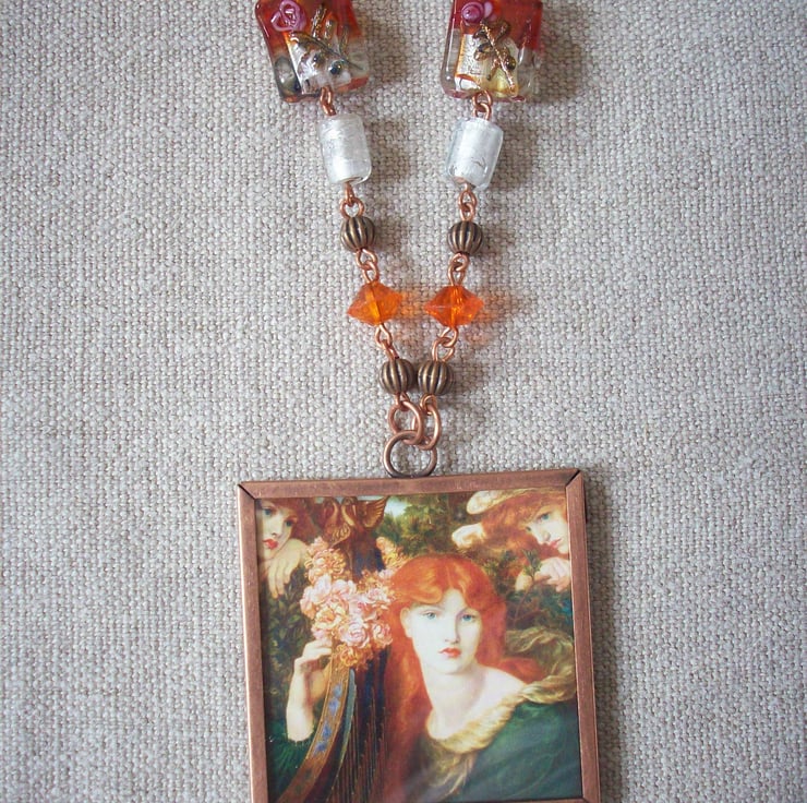 Found image under glass. One of the later lush oil paintings of Alexa Wilding, she of the red hair and cherry lips, framed among roses while she plays a harp. I think the original of this work is in London's Guildhall. The reverse shows more roses from another work by DGR 'The Roman Widow'. The rose theme is echoed in the intricate applied handmade rose beads of the beaded chain. I just had two fabulous burnt orange vintage glass beads left to match into the vibrant hair colour, and other beads are of foil lined glass, white and copper, to blend in. Comes to you in an organza bag. I always use Special Delivery for the insurance cover for both buyer and seller. Thanks for looking and for supporting handmade!