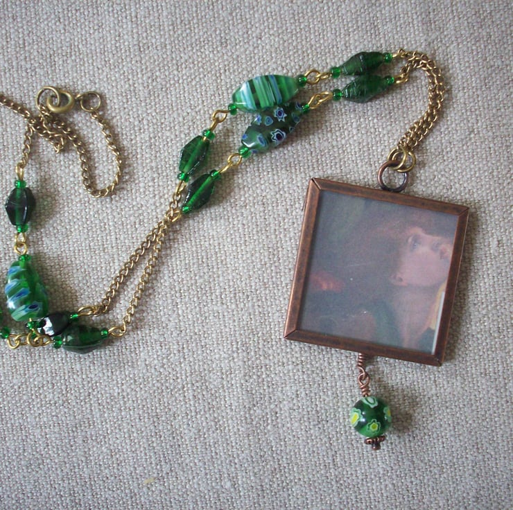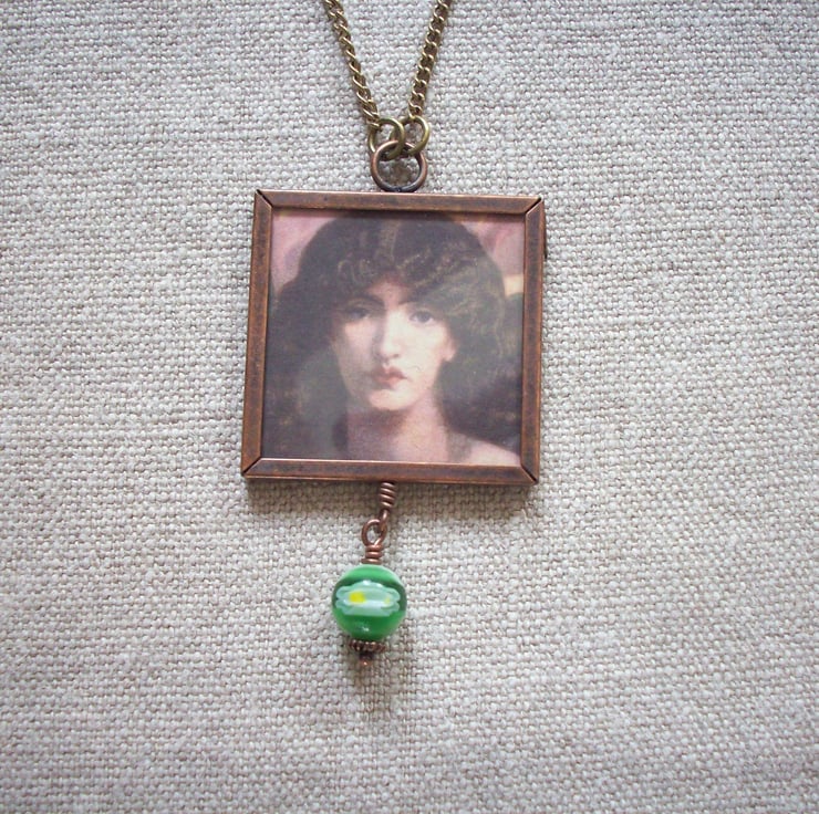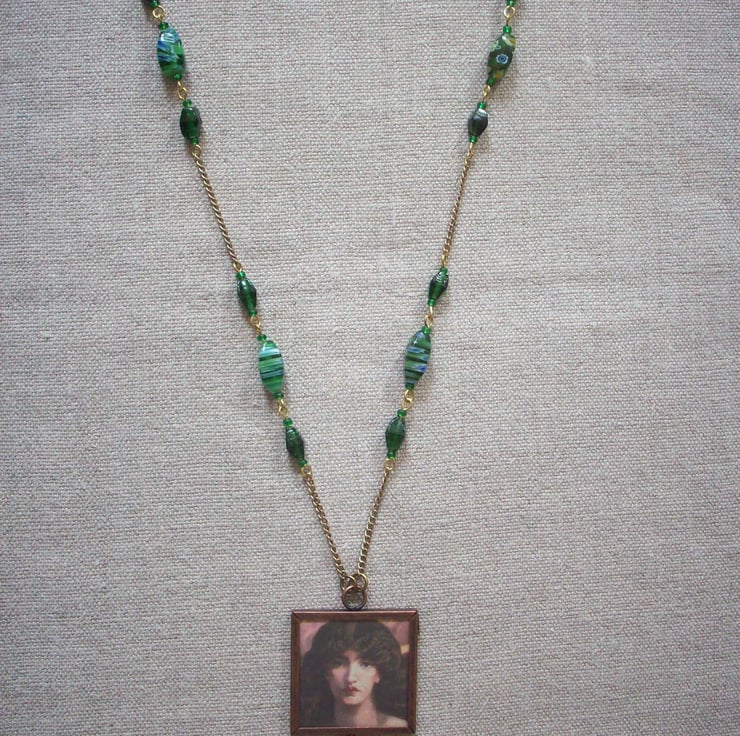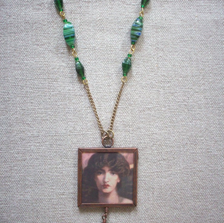 Yes this is the poster girl for the 2013 Tate Britain blockbuster exhibition 'Victorian Avant Garde', Jane Morris posing as the Goddess. It's a powerful image of woman reflecting the enormous stature Jane held in the artist's later life as muse and love. The unrequited nature of the relationship adds intensity and poignancy to the emotion illustrated. The reverse shows a detail from the same work under frosted glass. Found image under glass. Set on a beaded chain of deep green handmade mosaic beads specially selected, with another as a drop. Comes to you in an organza bag. I always use Special Delivery for the insurance cover for both buyer and seller. Thanks for looking and for supporting handmade!