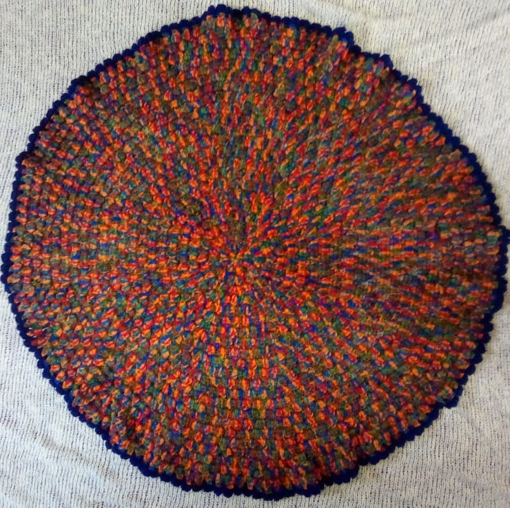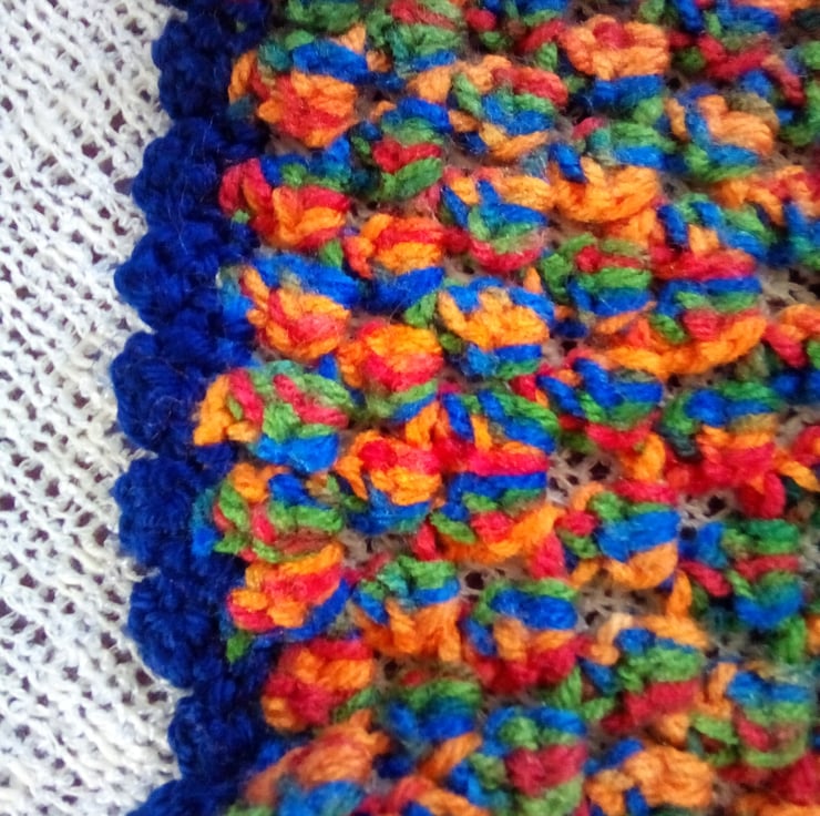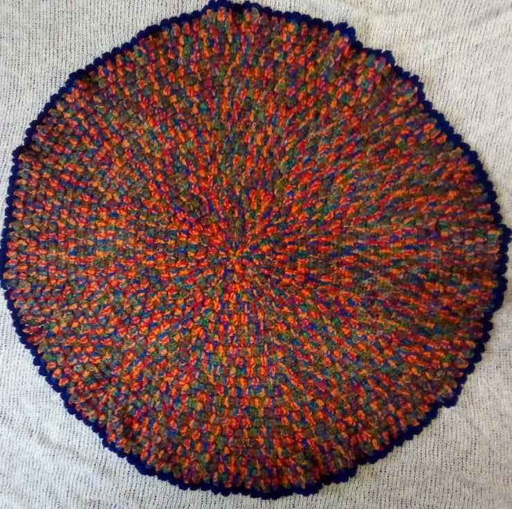 Circular baby blanket, sometimes called a Burrito blanket as the idea is that it can be used to swaddle tiny babies. This blanket was created from the centre out, using treble cluster stitches until I reached the right size. This blanket measures just shy of 74cm across (29 inches in old money). It's in a colourful self patterning baby yarn - it's got red, orange, blue and green running through it. I finished it off with a navy blue yarn.