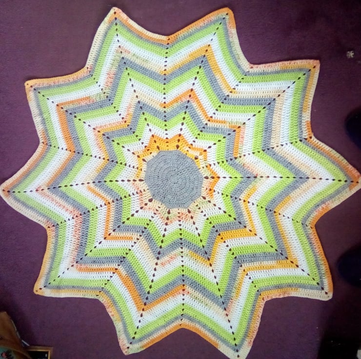 I had beautiful colours of yarn in my collection. I liked the 10 point star design, but not in the colours suggested or the thickness of yarn in the pattern I had, so I used the double knit thickness of yarn, adapted the stripes to suit the colours I was using and ended up with a 10 point star blanket that looks a bit like a sunflower bursting through.