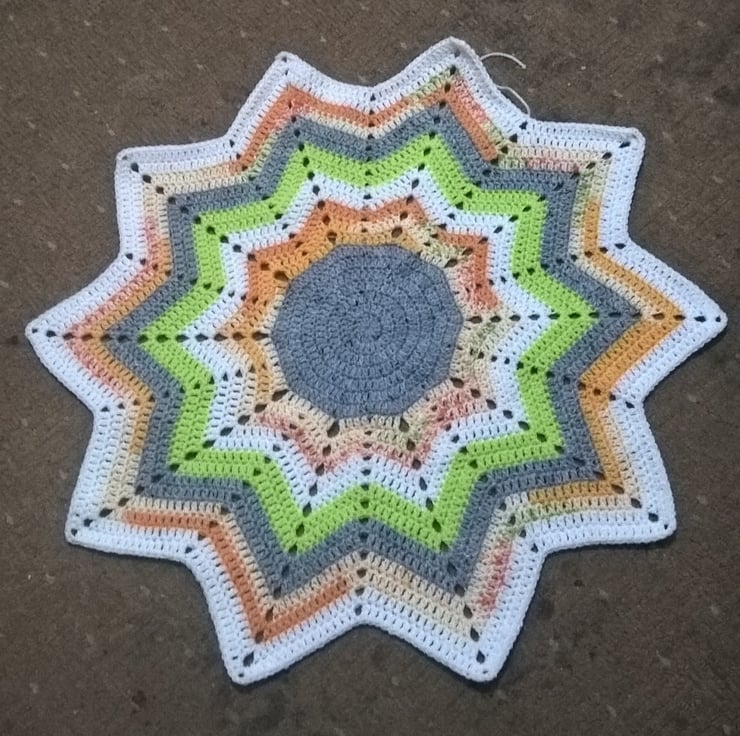 A from the middle out blanket. It's a 10 point star design, but the way I arranged the colours makes this take on a flower look too (a funky looking sunflower?) The orange yarn used for this is self patterning, so it gives this blanket a unique look. I also only had one ball like this in my house, so I can't make the same thing again. The finished blanket is about 99cm (39 inches - single bed width) across in both directions, fullest point to fullest point. The design I followed was for a floor mat, but I used double knit yarn and added extra rounds until I was happy with the size and had ran out of yarn.