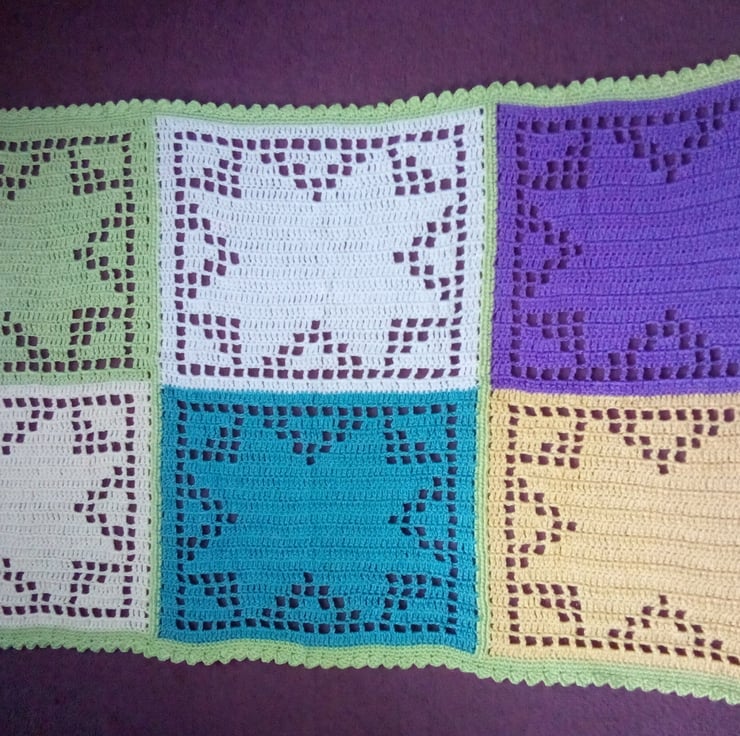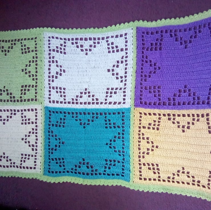 A rectangular blanket made up of 6 blocks of colour, each with a filet crochet star motif in them. The blanket has the following colours: teal, cream, purple, lime, white and yellow. The outer border is lime. This is a light blanket, perfect for the summer. It's made in double knit yarn. It's roughly 117cm (46 inches) by 65cm (25.5 inches).
