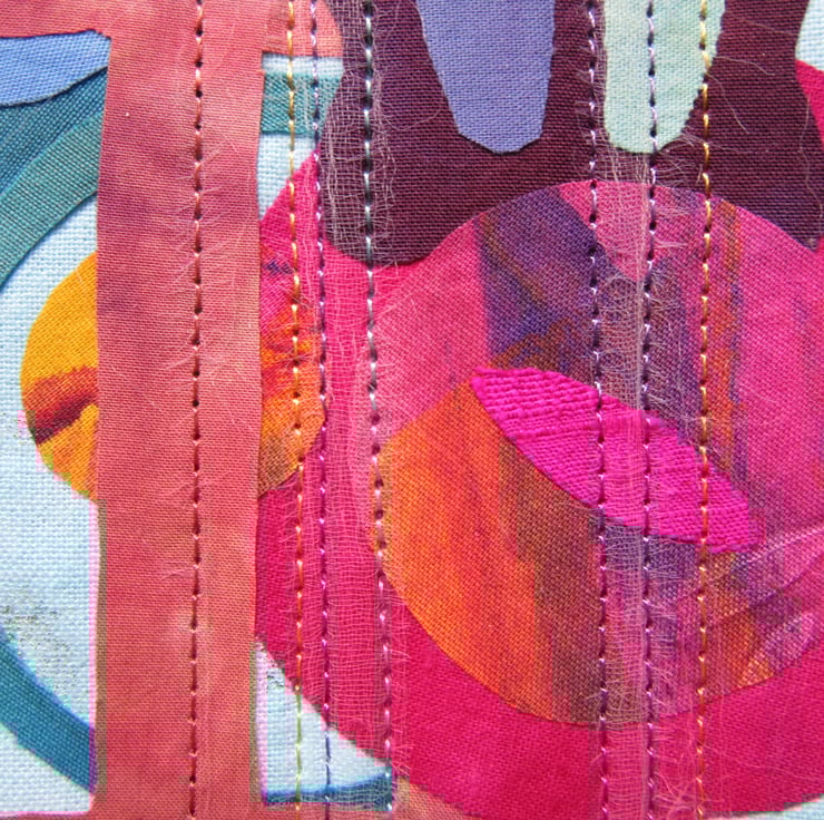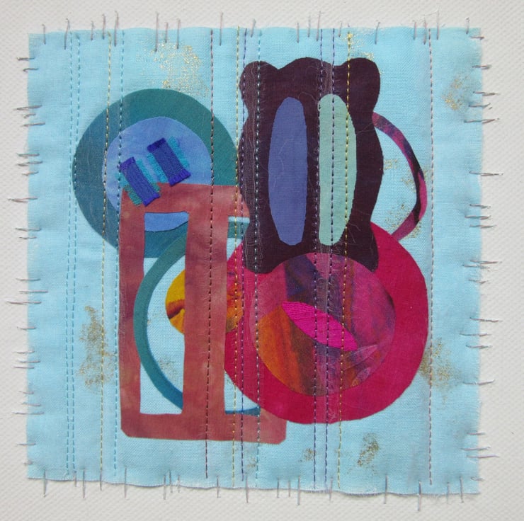 Abstract contemporary applique collage that has been decorated with machine stitching to give a lightly quilted appearance. Turquoise, peach and mauve dyed fabric and a tiny amount of commercial patchwork fabric and silk have been used. A hint of gold has been used to decorate the background fabric. When finished the work has been hand stitched to the white canvas and a misting of white acrylic paint applied over the edges.
