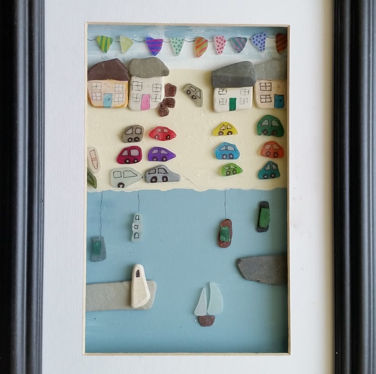 A Cornish beach scene based loosely on the pretty harbour village of Port Isaac (Port Wenn in Doc Martin) created out of pieces of genuine Cornish sea glass, sea pottery and stone all set inside a 26cm x 35cm glazed box frame in either black or white.