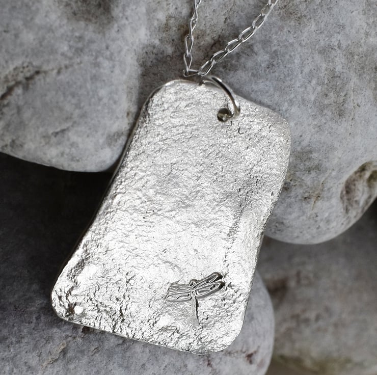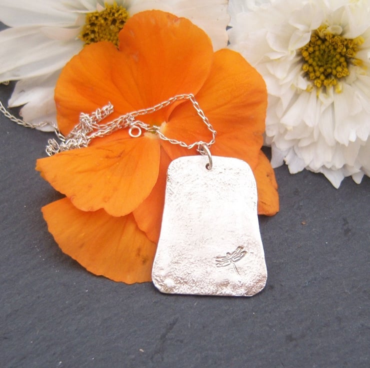 A reticulated sterling silver pendant with a tiny dragonfly imprinted in the bottom corner. Reticulation is a method of giving the silver a texture by firing and quenching several times over - the effect is very individual, it can't be replicated exactly the same.