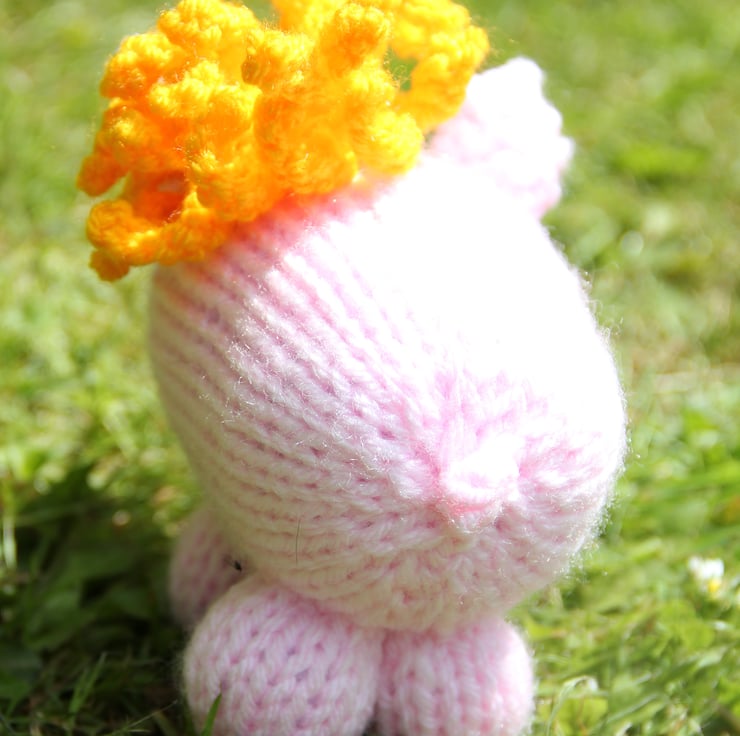 New to the sty, a bigger piggy with a dandelion hat. Hand knitted in baby chunky yarn to my own piggy design so she is larger than my usual pigs & piglets. Dandy stands 3 1/2 inches tall (without hat) and is 5 inches from tip of snout to wiggly tail.
