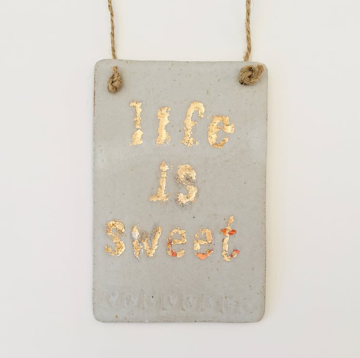 Novelty ceramic hanging board. The wording on this board is 'Life is sweet'.