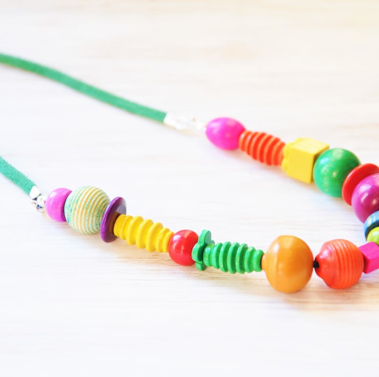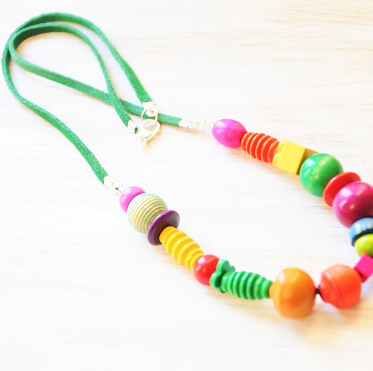 This buttoned Dark Wood Necklace. Necklace is quirky and soothing for the eyes. Made from small and large painter wood beads. Finished it off with genuine green leather cord.