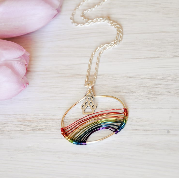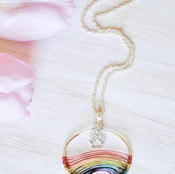 This gorgeous wire wrapped Rainbow Bridge Necklace is perfect Pet memorial Jewelry, Pet Keepsake, Pet loss gift. Have been designed and made to reflect the Rainbow Bridge theme.