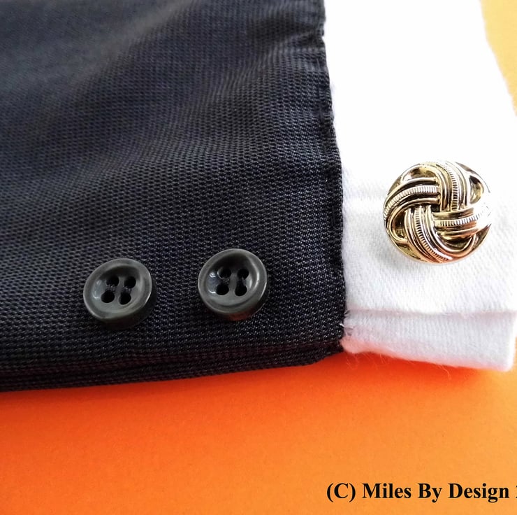 It has two small dark grey buttons securely sewn onto the suit sleeve and an ornate gold plastic button sewn on to the white shirt cuff to resemble a cufflink.