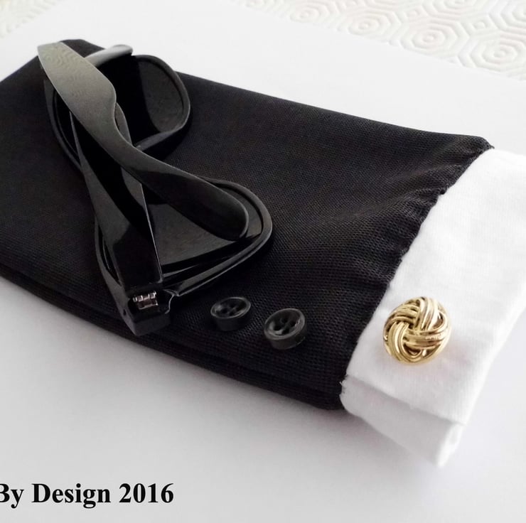 The case has been made with a dark grey suiting material with a white cotton shirt cuff. It has been fully lined in dark green fleece to keep your glasses scratch free.