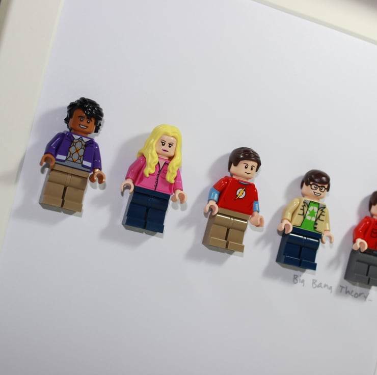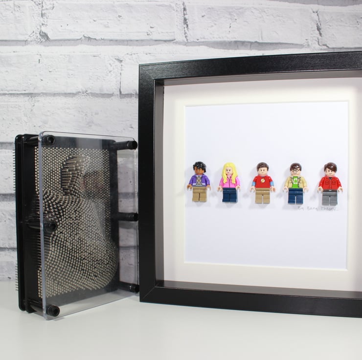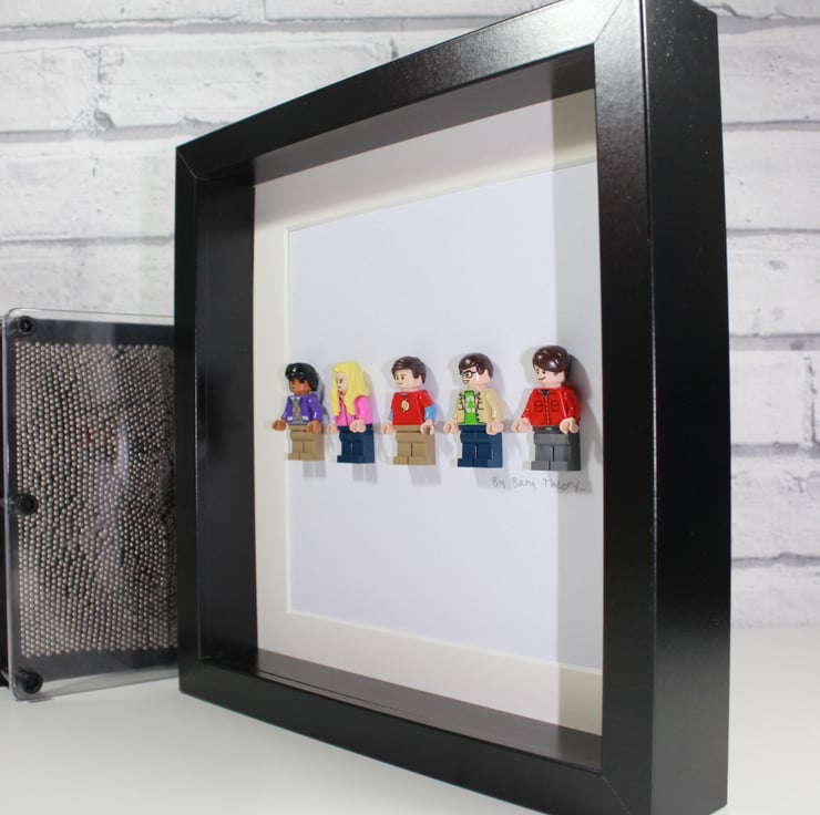 Our little flat mates has been carefully mounted in to a deep box frame. You will find Raj, Penny, Sheldon, Leonard and Howard beautifully presents in a simple and awesome piece of work. We have printed "The Big Bang Theory" underneath in a handwritten font - this means that the minifigures really are the stars of the show!