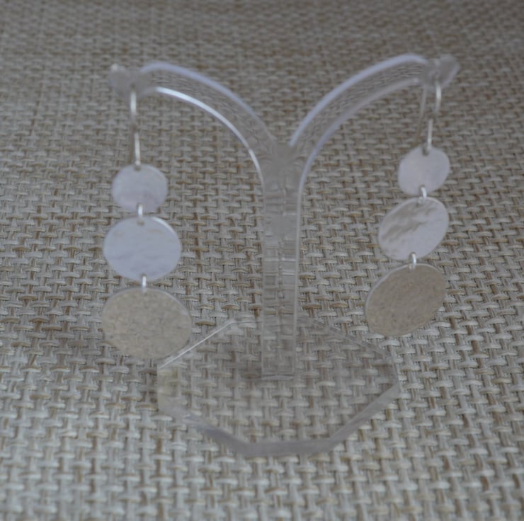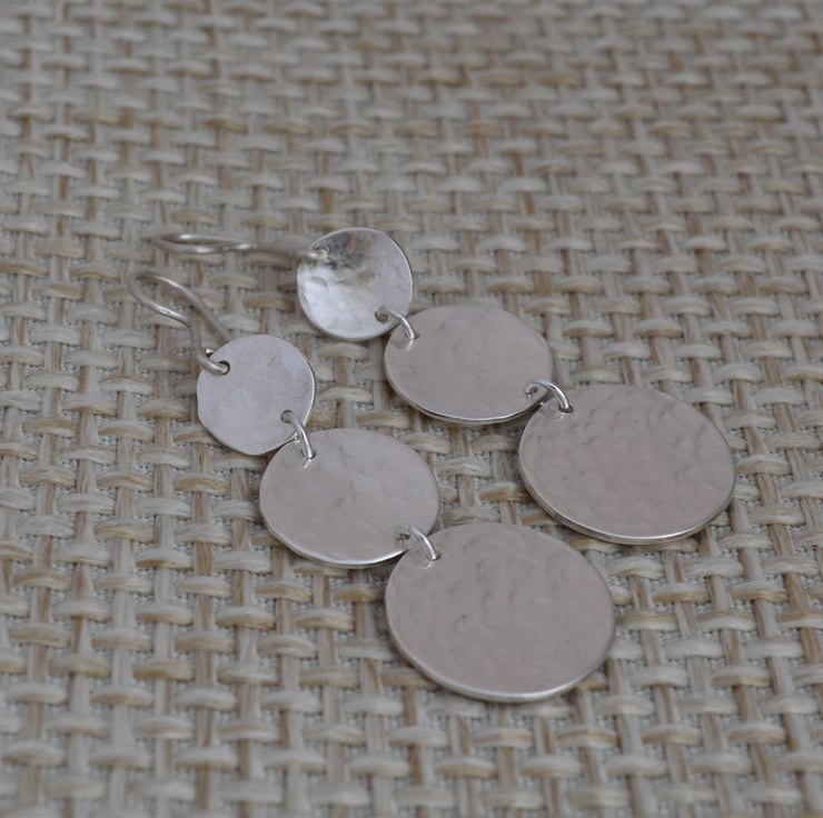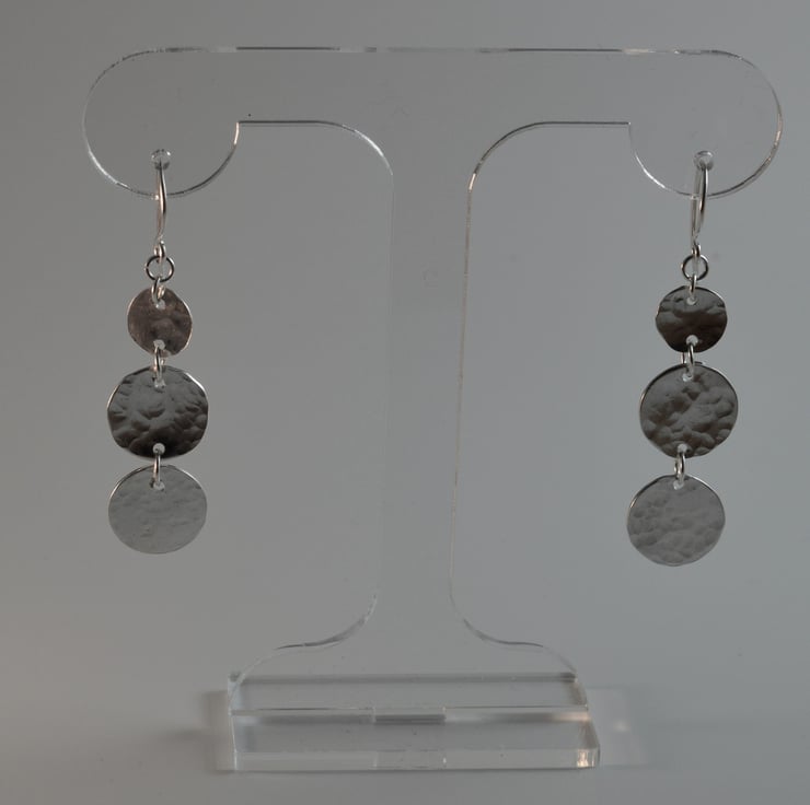 Finished length is 4 cm so they are long. Made up of three sterling silver discs each hand sawn from sheet silver. The discs are 1.6 cm, 1.4 cm and 0.9 cm diameter and have been textured by lightly hammering. I have used small jumps rings to join the discs together, added a handmade fishhook ear wire and then polished.