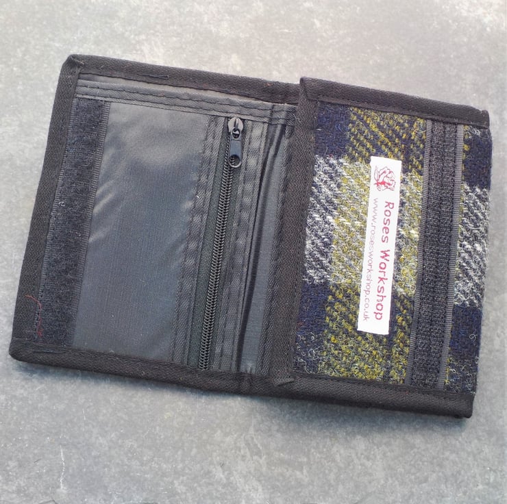 The outside of this stylish trifold wallet features Harris tweed fabric in a wine red and olive green check design. The inside is nylon with lots of pockets for notes and cards. There is a small zipped pocket - please note this is for a small item such as a car-park token, and is not intended to hold large quantities of coins.