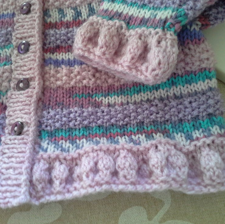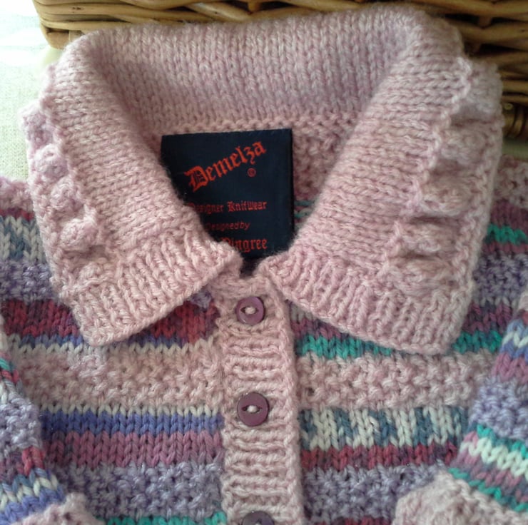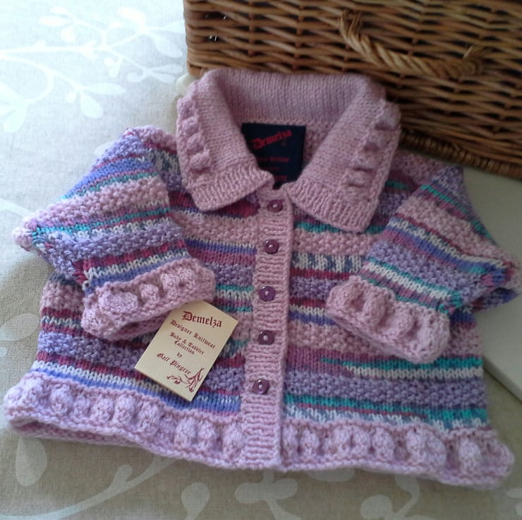 This sweet little jacket/cardigan has been lovingly hand knitted with quality branded double knit yarns. The item is machine washable for a busy mother's convenience and the care instructions are woven into the Demelza garment label for lasting reference. It will be ideal for a new born baby gift or baby shower. It is often well worth purchasing a baby gift for over a 3 months size as every new mother suddenly runs out of clothes within this time because everyone gifted the first size for the new arrival!