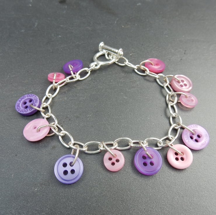 Pretty buttons in shades of pink and purple have been attached to this silver plated bracelet to make the perfect delicate bracelet. The twelve buttons are in differing shades and sizes and all the tones harmonise together perfectly.