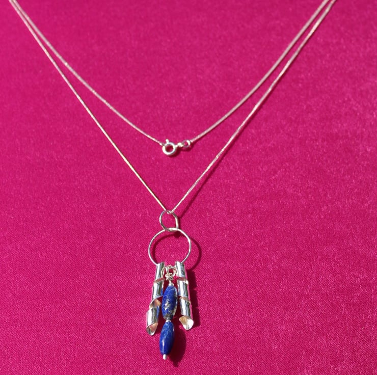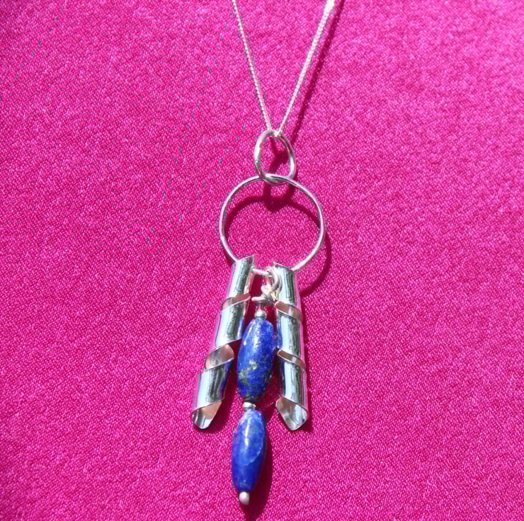 I loved making this pendant, I made two silver spirals and put them onto a silver ring and then added two lapis lazuli beads on silver wire to sit between the spirals which reflect in the high shine of the silver spirals.