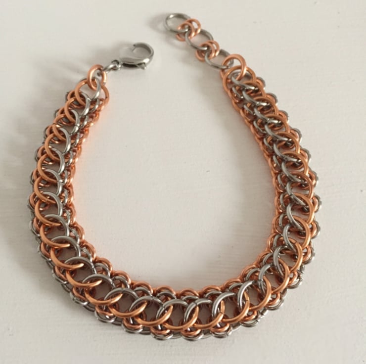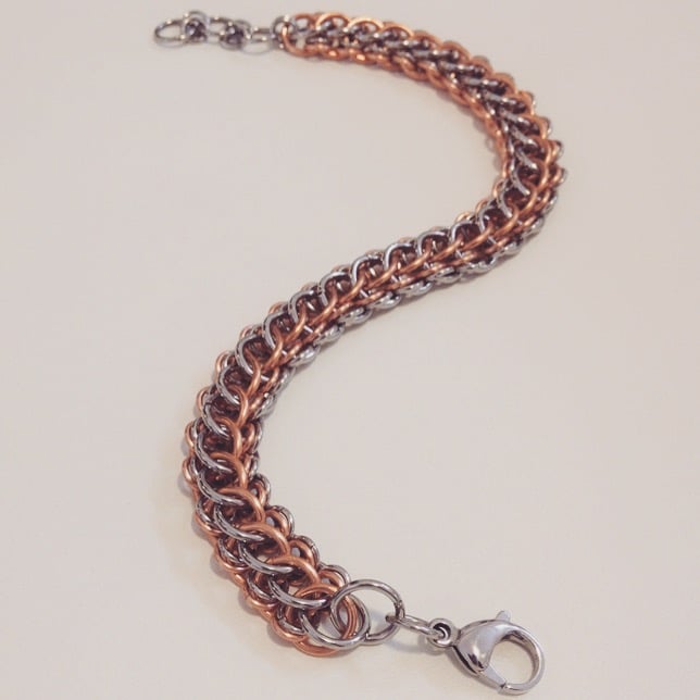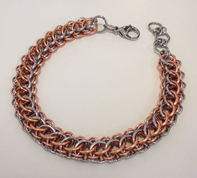 I used to make this design in a smaller size. I came up with this design by using larger chainmaille rings, and then adding some smaller rings in alternating metals. This feature has made it a popular choice for men of all ages.