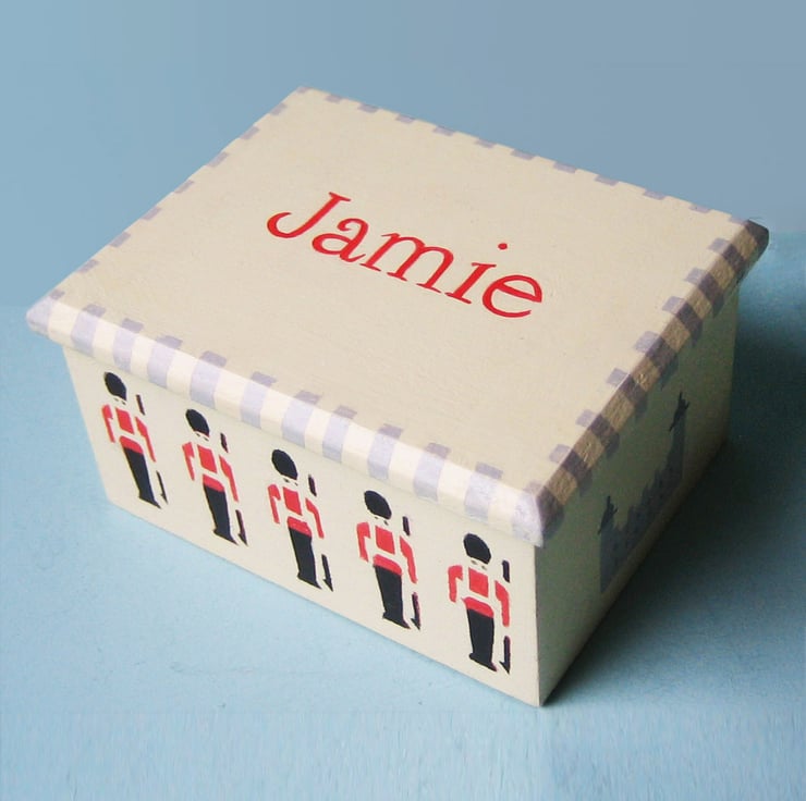 It features a border of smart London soldiers front and back, with images of the Tower of London on the short sides. A theme that appeals to lots of little boys.