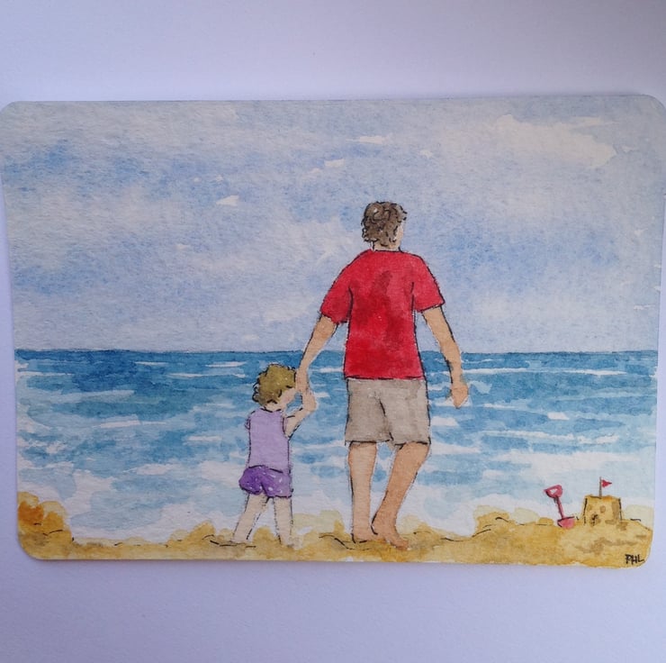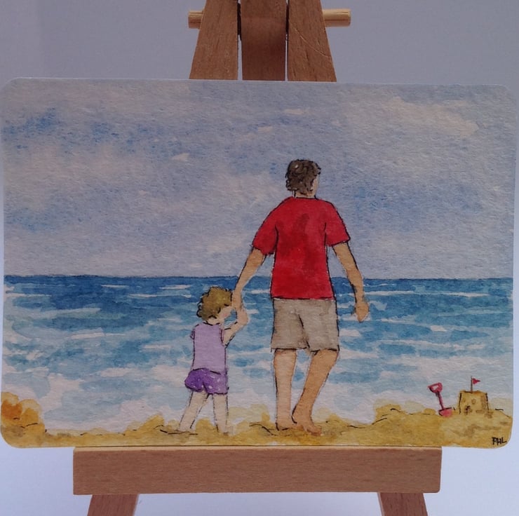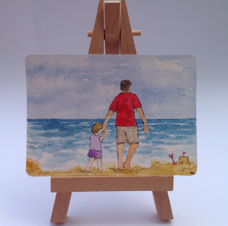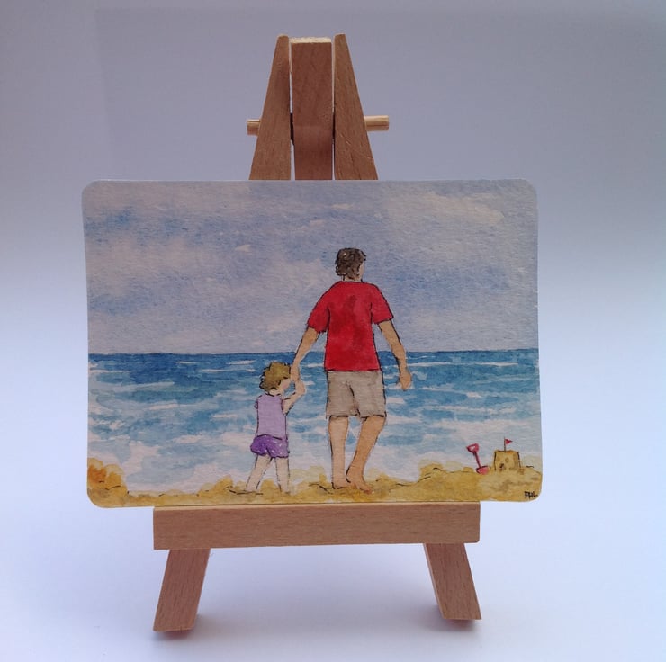 This ACEO is an original, hand painted watercolour of a little girl on the beach with her Dad. They have just built a sandcastle and are now dipping their toes in the water for a little paddle!