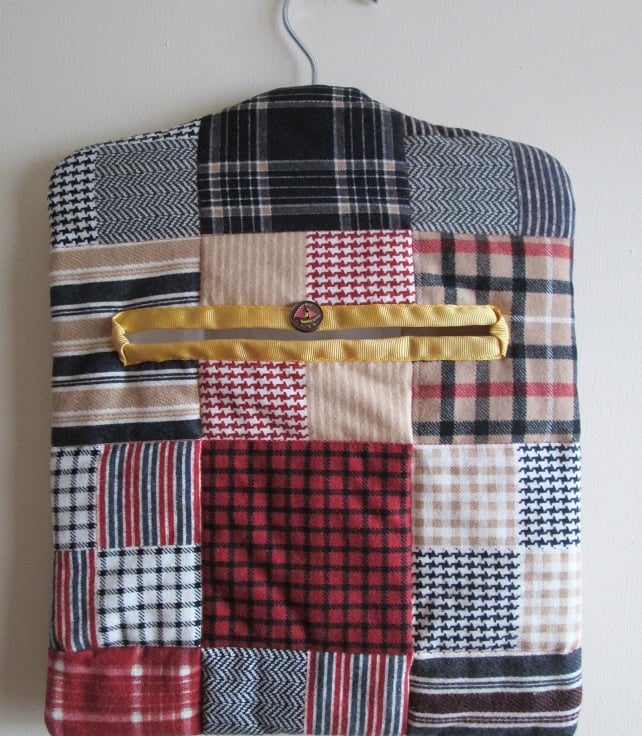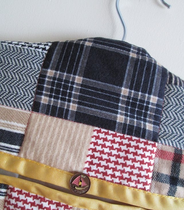 Not just for pegs, hanging storage bags can be used for scarves, gloves, belts, phone accessories, plastic bags and anything else you might want to keep handy. Lightly quilted, this one in plaid flannel is lined with cream cotton and had a sturdy wood and metal hanger.