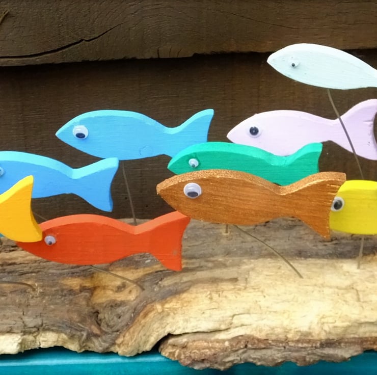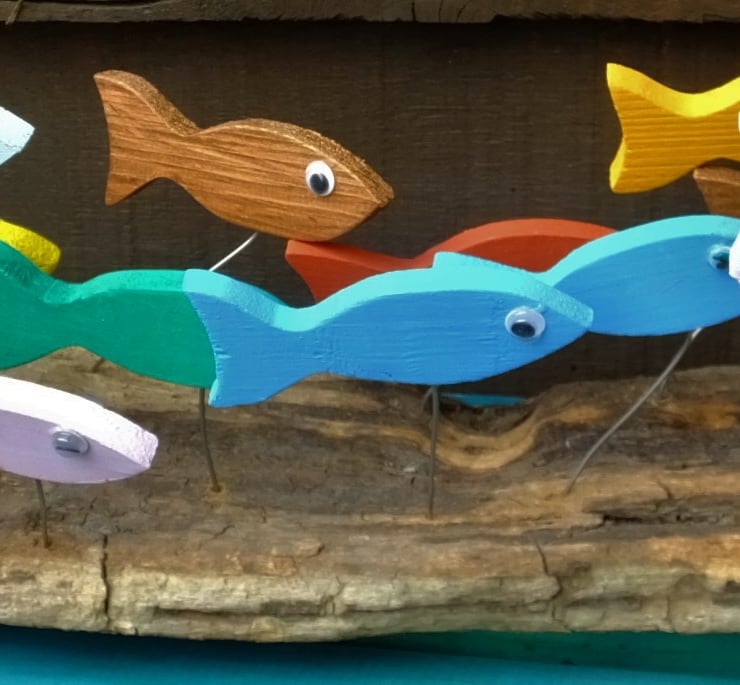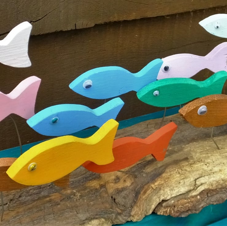 I HAVE MADE SOME COLOURFUL "SHOAL OF FISH" DISPLAYS, THEY COMPRISE OF ABOUT 14 HANDPAINTED FISH WITH BOGGLY EYES MOUNTED ON A PIECE OF CORNISH DRIFTWOOD.