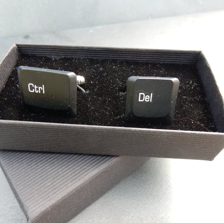 Quirky cufflinks using upcycled laptop keyboard keys - the black Delete and Control keys are fixed to the top of silver plated cufflinks. Ideal for those who maybe like to be in Control a little too much (!), like their books, the computers, their IT or.... just like to wear something fun.