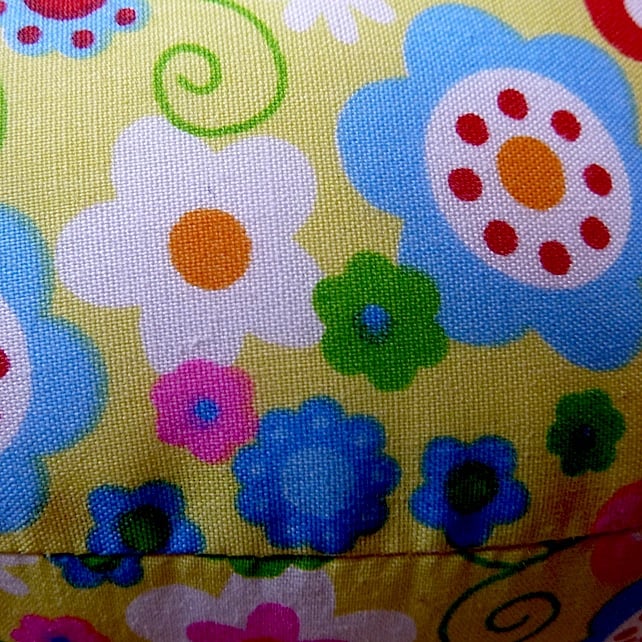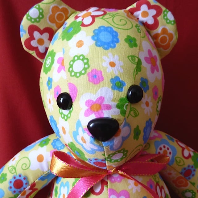 This colourful teddy bear is made from polyester cotton fabric which has a bright retro design.
