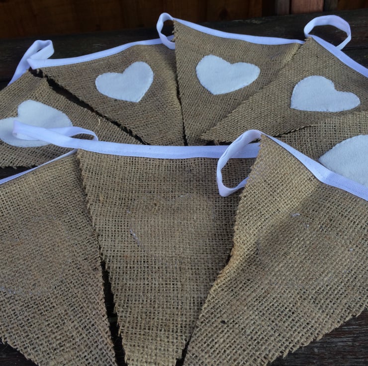 Handmade Wedding Bunting, with Hessian flags and felt hearts. Perfect for a rustic themed Wedding or Christmas Decoration