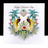 The amazingly popular parrot always portrays its own character. In this tropical scene my parrot is uniquely patterned with a traditional fruit and floral chintz pattern on a soft pale blue background. Perched high on a branch surrounded by palms he overlooks a bed of pink water colour flowers with dark blue leaves. Butterflies flutter around this hazy pastel blue imaginative scene of nature.