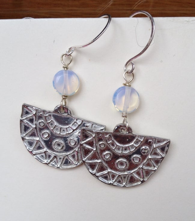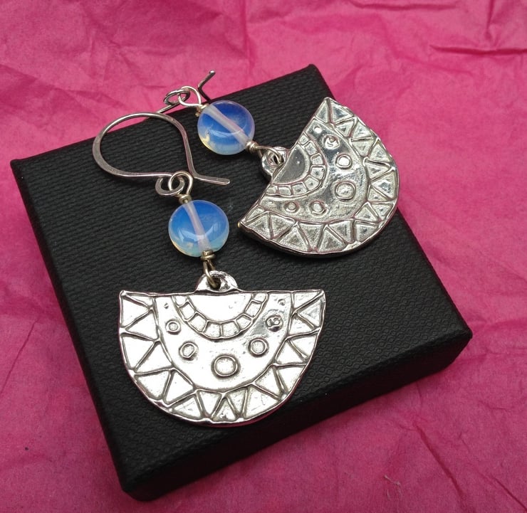Designed and hand made in my own workshop. I designed these fan shapes and fabricated them in silver with a raised geometric design to make them more affordable I then took a mold and cast them in fine English pewter.