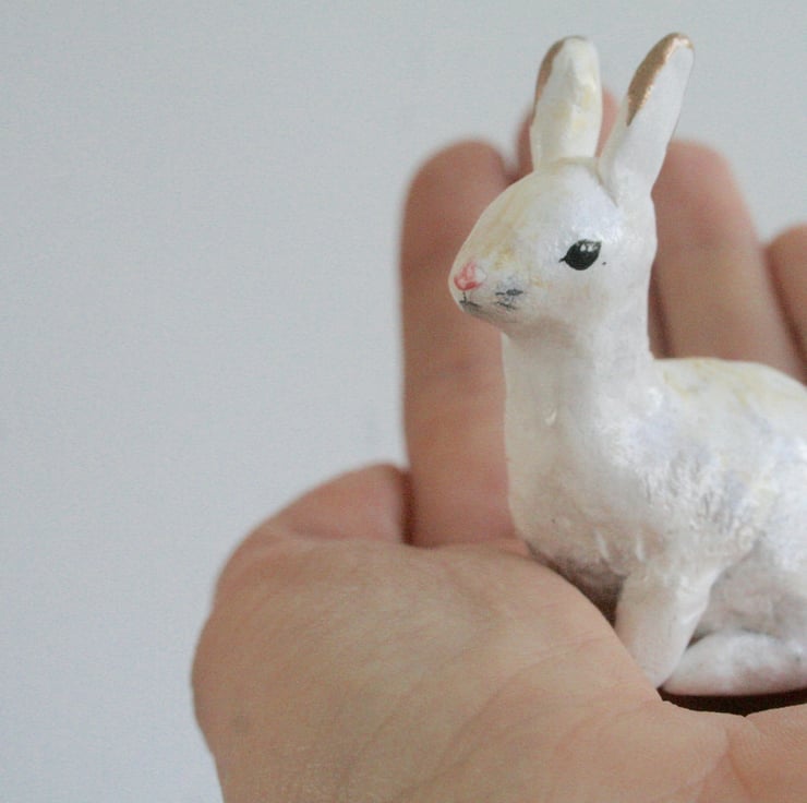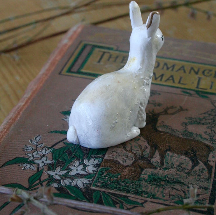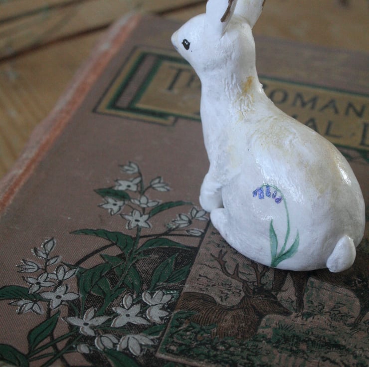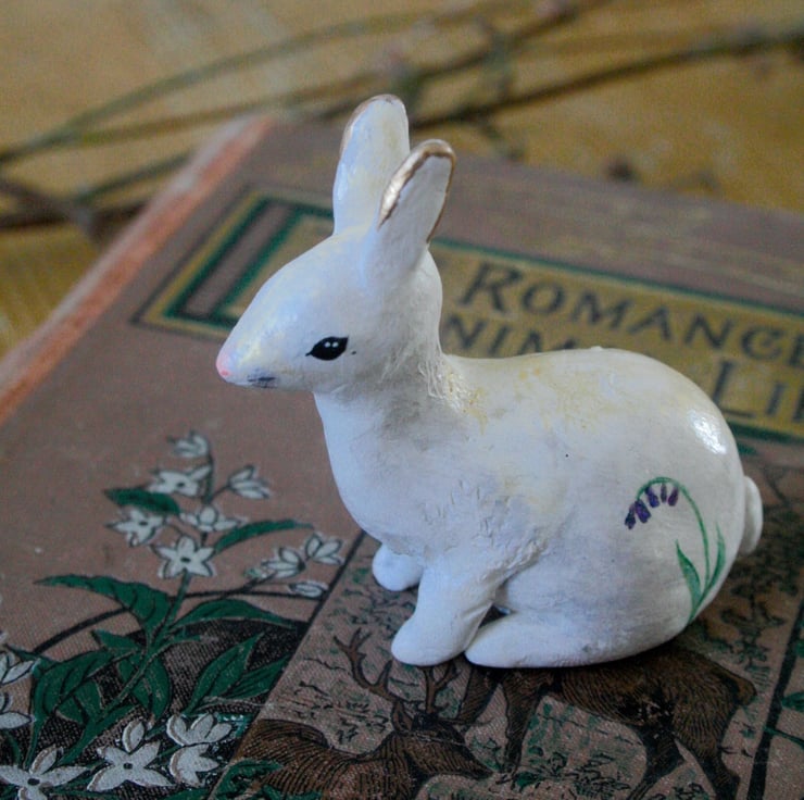 Hand sculpted rabbit. He has bluebells on one side, and golden tipped ears.