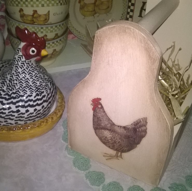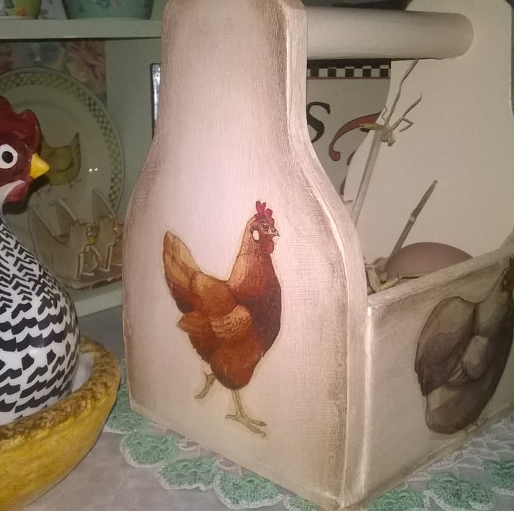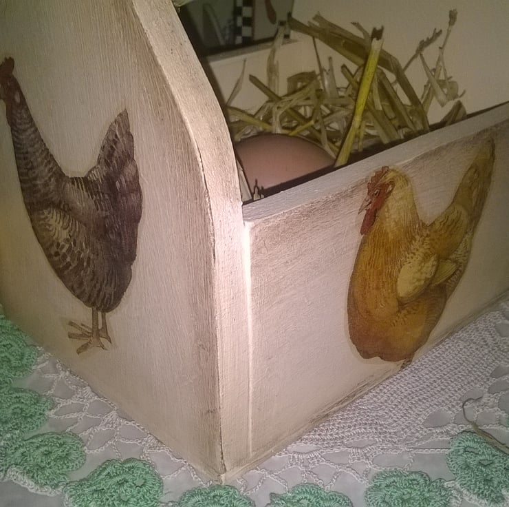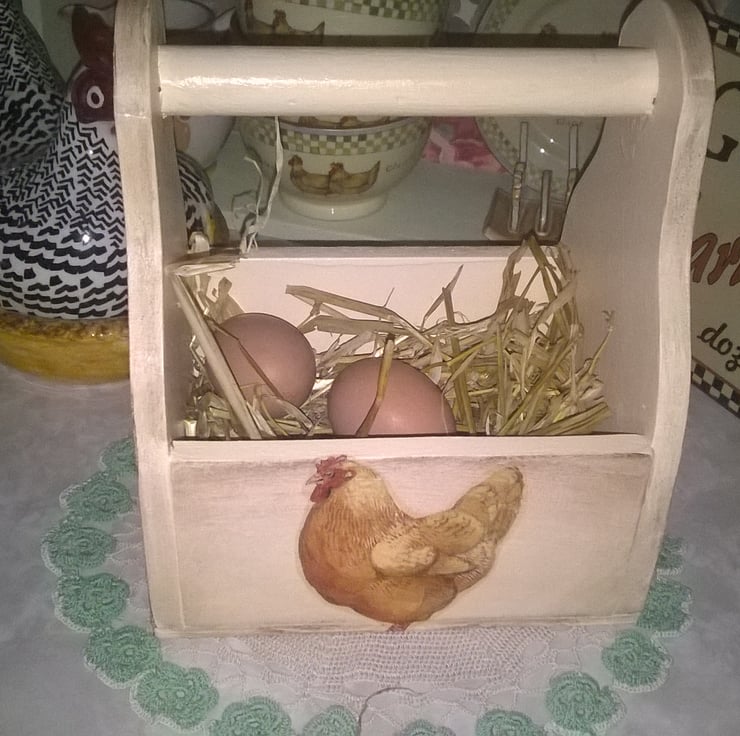 Painted in Farrow & Ball Pointing, Antiqued then decorated in Emma Bridgewater Country Chicken Design... It has then been sealed for a wipe clean finish... ( This Egg box will fit 10-12 Large Eggs)