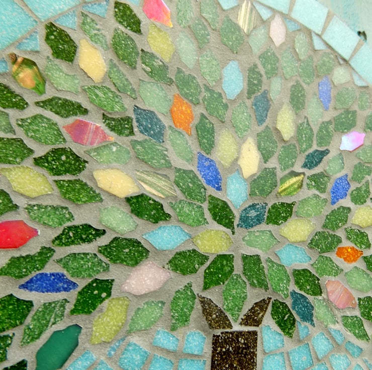 The design of this mosaic Summer tree has leaves made with matt, bright, translucent, iridescent, and metallic streaked Summer flower coloured tiles adding shine and sparkle against the other shades of green leaves. The background is a light jade green.