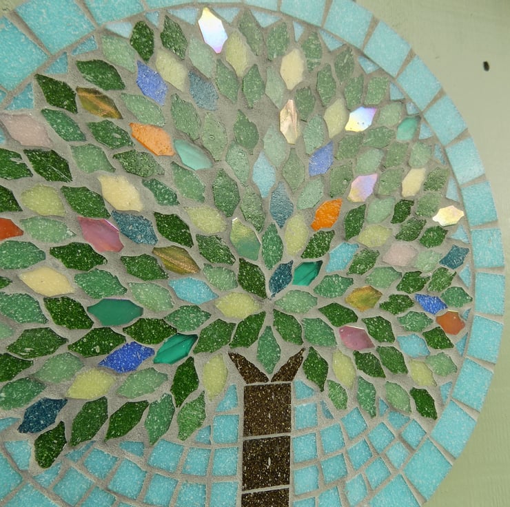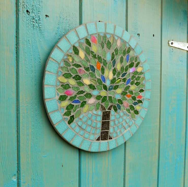 A 25cm (9.75 inch) diameter mosaic plaque made on a slate base with glass tiles and a grey grout designed to repel algae and mould. Finished with a securely attached D-ring for hanging.