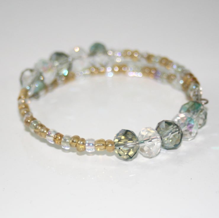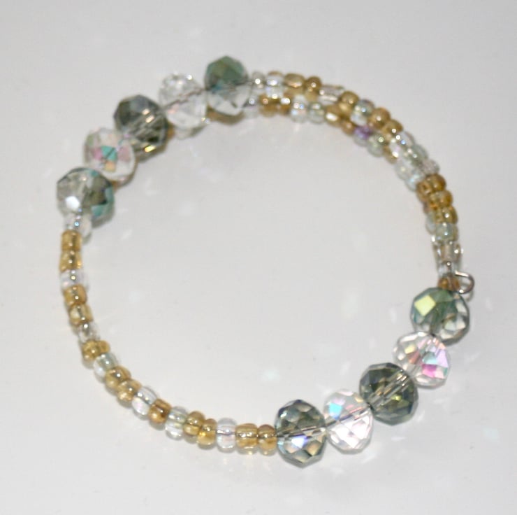 A very sparkly bracelet made with shiny clear and smoky brown seed beads and faceted clear and grey crystal rondelles. It is made with memory wire which retains its shape and can fit most wrists.