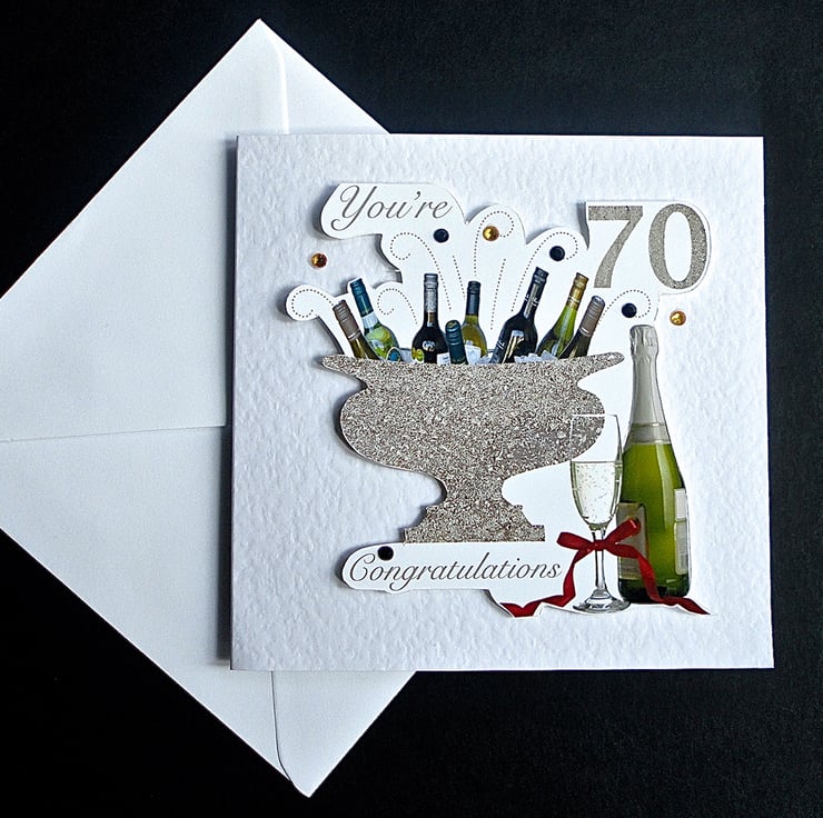 This hand-crafted card has a classical stone urn cooling bottles of wine with a glass and bottle of champagne in the foreground. This card reads “You’re 70, Congratulations!” The design is hand-cut and mounted on a white card. Small glass gems embellish the scene. Inside is a smaller champagne bottle and glass, saying Congratulations, with plenty of space for your own message.