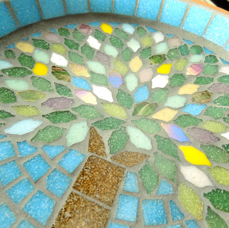 This mosaic bird bath has a Spring tree design with random leaves of bright, translucent, iridescent, and metallic streaked glass tiles adding shine and sparkle against the other shades of green leaves. The background and border are a Spring sky fresh turquoise blue. It's perfect for your garden birds to bathe in and and it also makes a great water dish for hedgehogs to drink from if it's placed on the ground.