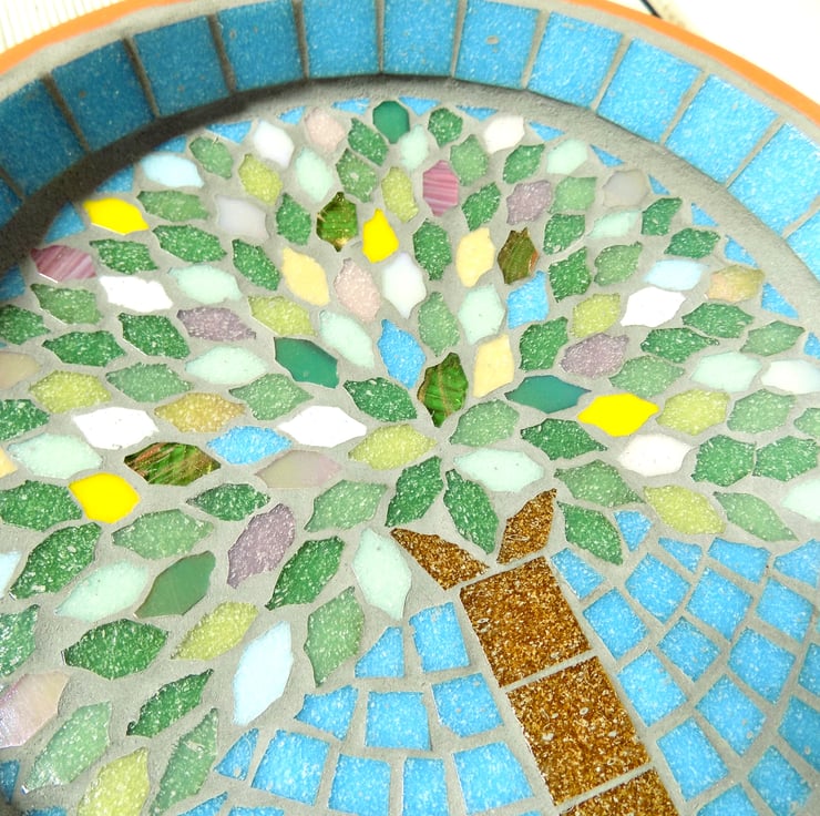 A 25cm (9.75 inch) diameter terracotta saucer with a mosaic made with glass tiles and a grey grout designed to repel algae and mould.