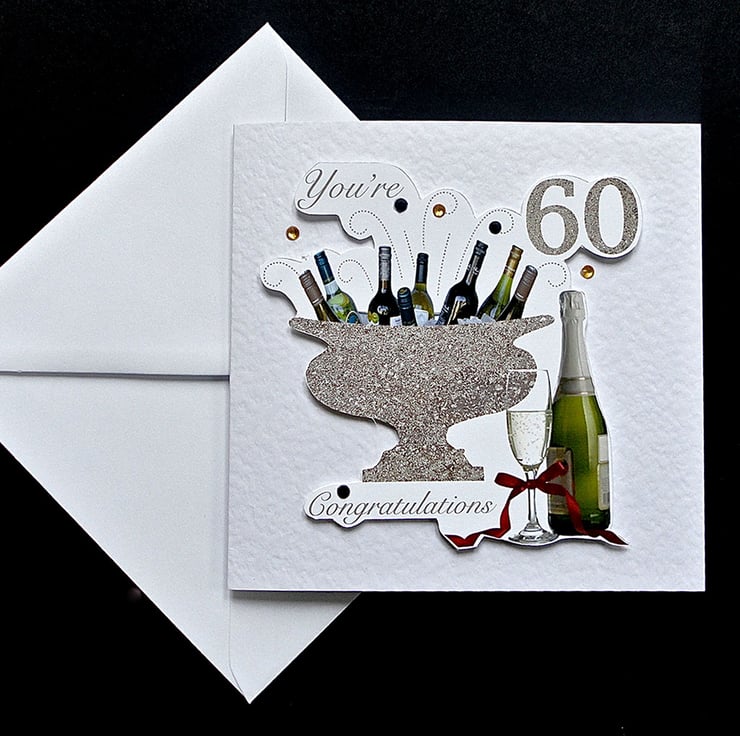 This hand-crafted card has a classical stone urn cooling bottles of wine with a glass and bottle of champagne in the foreground. This card reads “You’re 60, Congratulations!” The design is hand-cut and mounted on a white card. Small glass gems embellish the scene. Inside is a smaller champagne bottle and glass, saying Congratulations, with plenty of space for your own message.