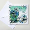 This card gives a glimpse into a tropical rain-forest, with large imaginary exotic leaves forming a dense display of blues and greens. Hand-painted in water colour, flecked petaled lilies become part of the scene; as small turquoise birds, butterflies and tiny dragonflies flutter around on a soft green ombré background framed in white.