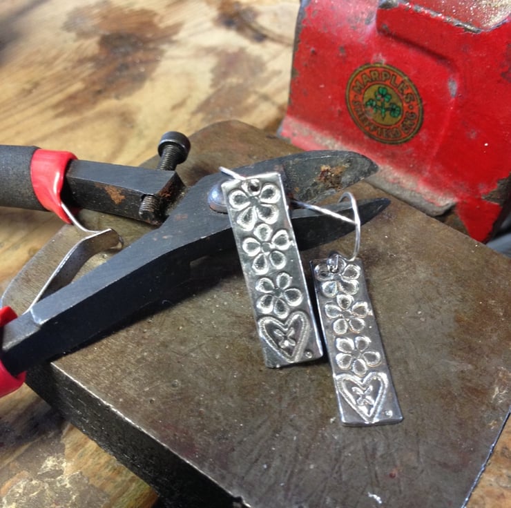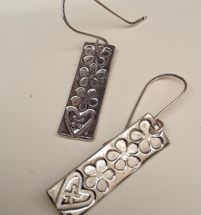 Sterling silver ear wires are hand forged with cast pewter dangles.