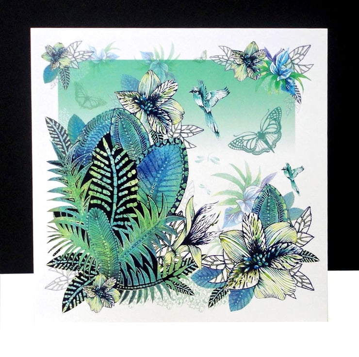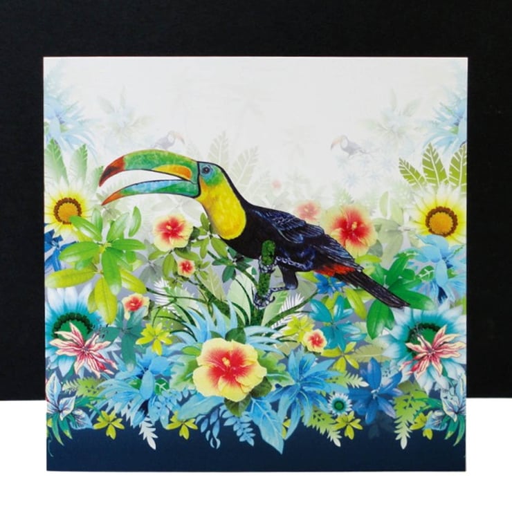 This amazing Tropical scene combines two of my most popular card designs, ‘The Tropical Forest’ design as a background, and the ‘Tropically Toucan’ for its brightly coloured stunning bird. The majority of the elements in this design are hand- painted in water-coloured inks. The perfect tiny Hummingbird is drawn in Illustrator, and all these images are brought together in Photoshop on a white ground.